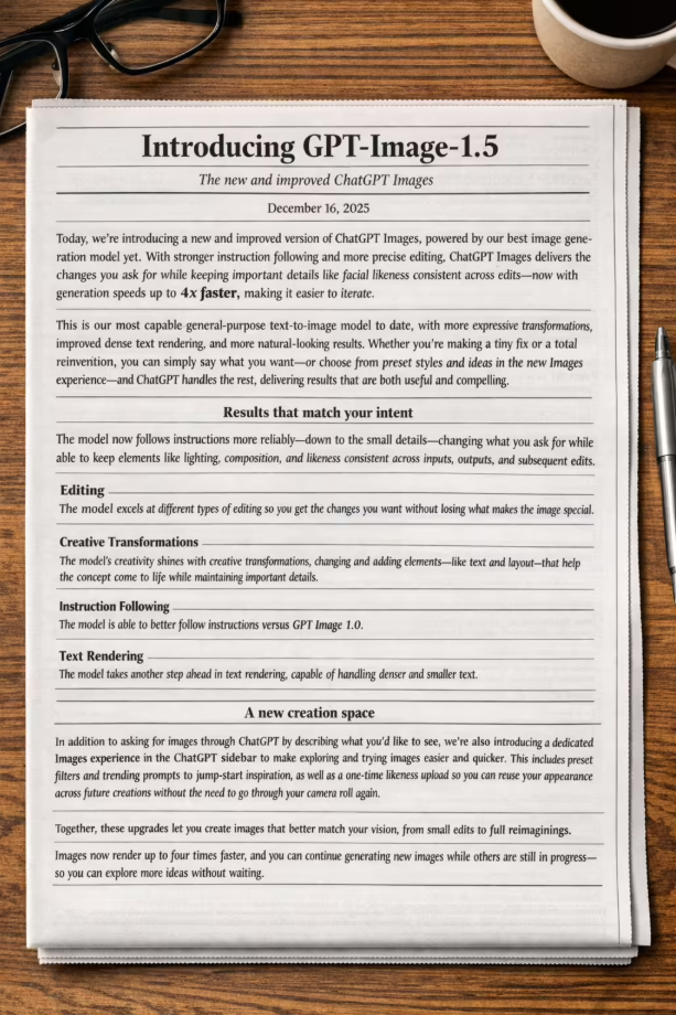 长期以来困扰 AI 绘图的“文本乱码”问题,在 GPT Image 1.5 中得到了显著改善。新模型在文本渲染方面表现优异,能准确地将文字融入图像中。